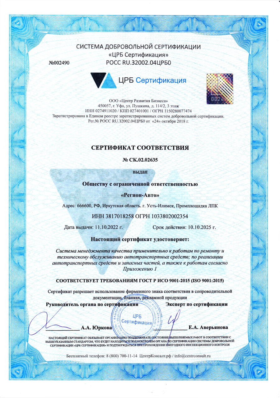 Сертификат соответствия системы менеджмента качества 2022 г. |
